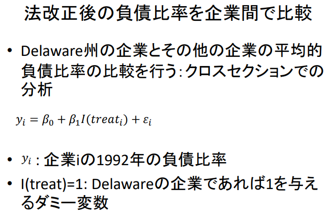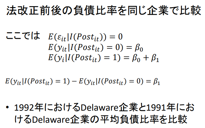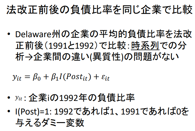 yᵢₜ = β₀ + β₁ I ( Postᵢₜ ) + εᵢₜ - yᵢₜ = 기업 i의 1992년 부채비율