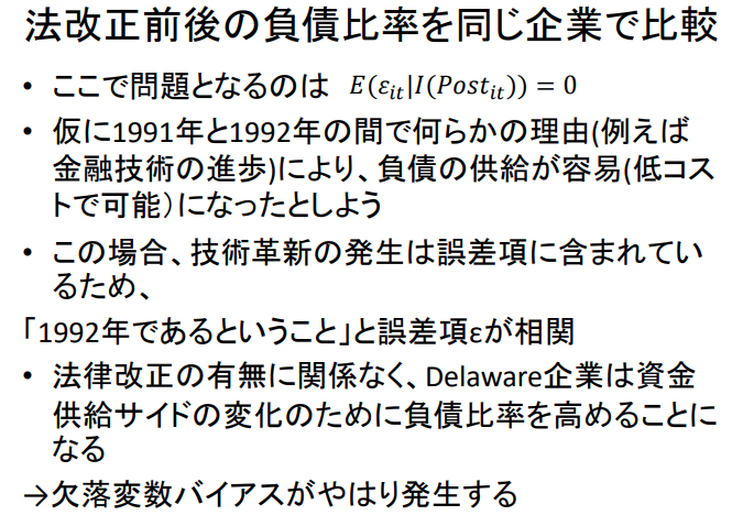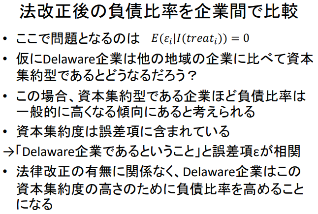 → Delaware 기업이라는 것 I ( treatᵢ ) 과 오차항 ε 가 상관관계 - 법 개정의 유무와 관계없이 Delaware 기업은 이 높은 자본집약도 때문에 부채비율을 높이게 될 것이다.