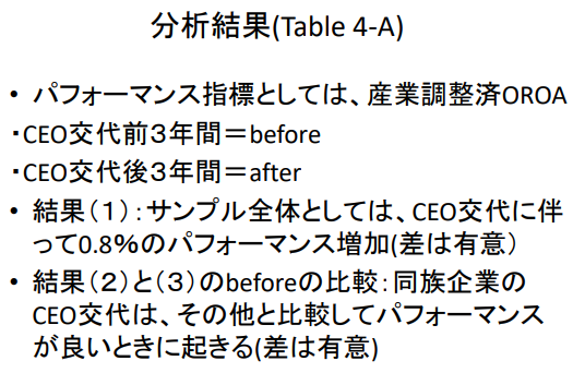 - 결과(2)와 결과(3) 비교: 동종기업의 CEO 교체는 다른 기업에 비해 성과가 좋을 때 발생(차이는 유의미)