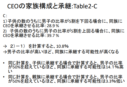 남자아이 비율이 50%를 초과할수록 동족에게 승계할 가능성은 14.3% 더 높다. - 같은 계산을 친족에게 승계하는 경우로 계산하면,