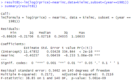 result81 <- lm ( log ( rprice ) ~ nearinc , data = kielmc , subset = ( year == 1981 ) )