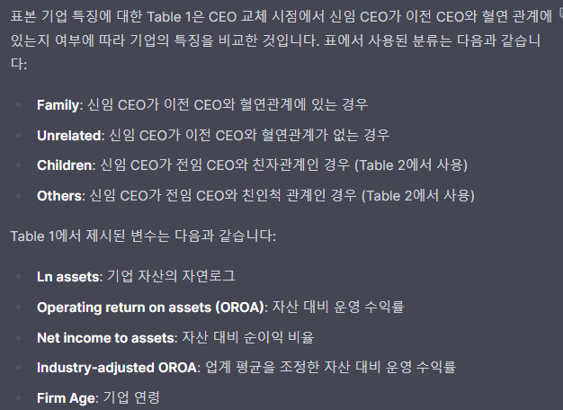 표 2. 퇴임하는 CEO의 기업 승계 및 가족 특성