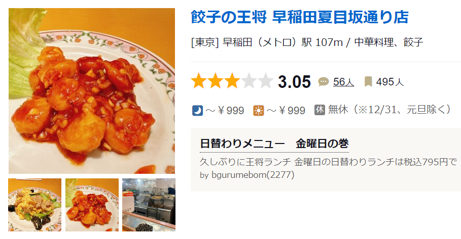 구글평점 3.6점.. ㅋㅋ 이해가 가는 점수다 Gyozaichiba Waseda · 1 Chome-13-5 Nishiwaseda, Shinjuku City, Tokyo 169-0051 일본 ★★★★☆ · 북경 요리 전문 식당 www.google.com 타베로그 평점은 3.27점.. 여전히 낮은 가