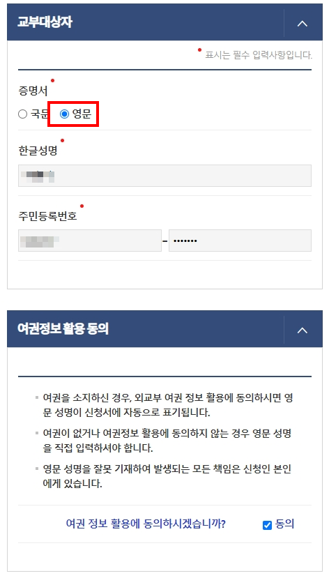 영문증명서 선택