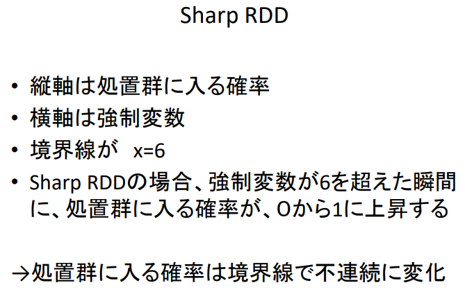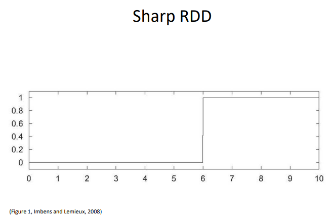 - Sharp RDD의 경우, 강제변수가 6을 넘어서는 순간, 처리군에 들어갈 확률이 0에서 1로 상승한다.