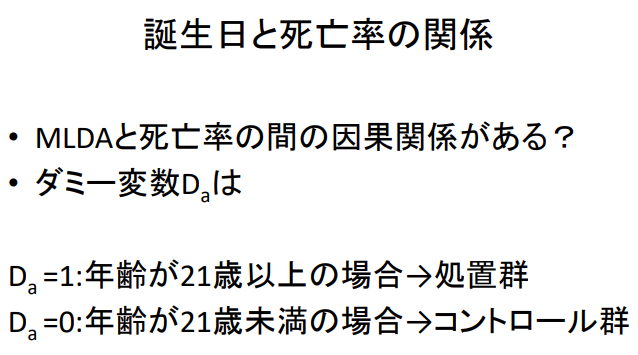 - MLDA(the Minimum Legal Drinking Age)와 사망률 사이에 인과관계가 있을까?