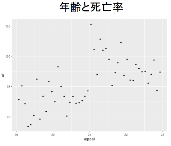+ geom_point ( data = AEJfigs2 , aes ( x = agecell , y = all ) )