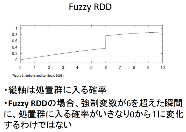 - Fuzzy RDD의 경우, 강제변수가 6을 초과하는 순간 처리군에 들어갈 확률이 갑자기 0에서 1로 바뀌는 것은 아니다.