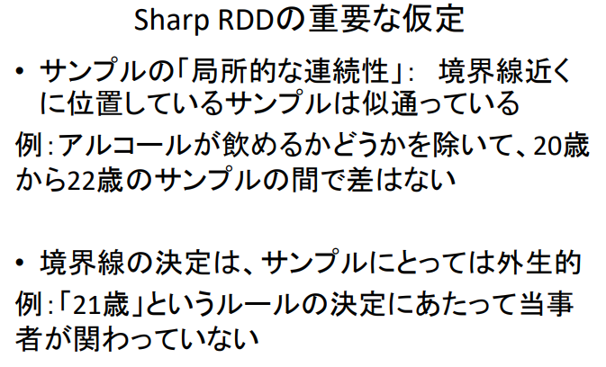 예: 20세와 22세의 표본은 술을 마실 수 있는지 여부를 제외하고는 차이가 없다. - 경계선 결정은 표본의 외생적 결정이다.