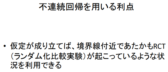 - 가정이 성립되면 경계선 부근에서 마치 RCT(무작위 비교 실험)가 진행되는 것과 같은 상황을 이용할 수 있다.