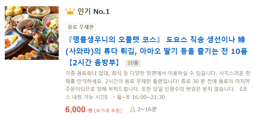 여러가지 코스가 있는데 일단 우리는 제일 싼 6천엔으로 주문햇다