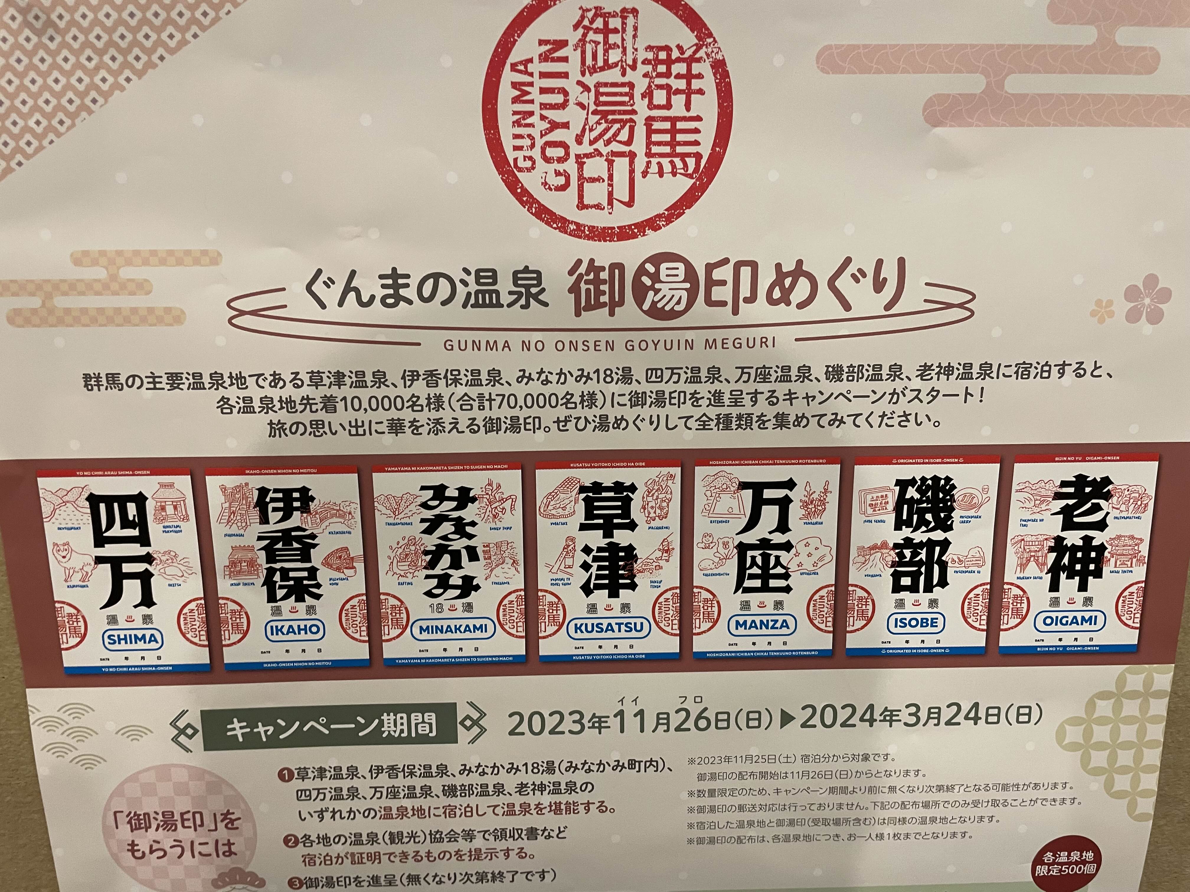 온천지인 쿠사츠 온천, 이카호 온천, 미나카미18탕, 시마 온천, 만자 온천, 이소베 온천, 노가미 온천에 숙박하면