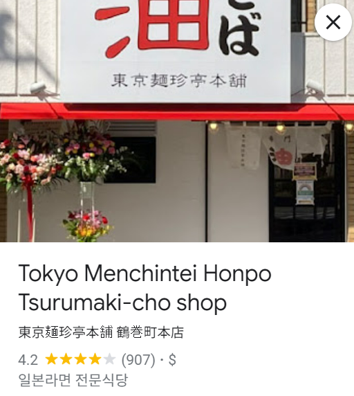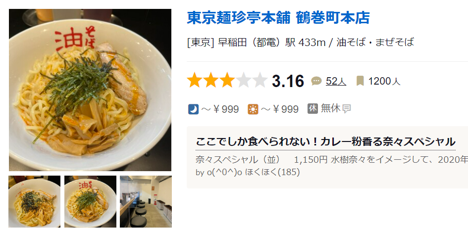 구글평점 4.1점 훌륭한 점수다 타베로그 3.24점 괜찮은 점수다 여기저기 몇개 정도 더 체인이 있어보인다 東京麺珍亭本舗 西早稲田店 (早稲田(メトロ)/油そば・まぜそば) ★★★☆☆3.24 ■知