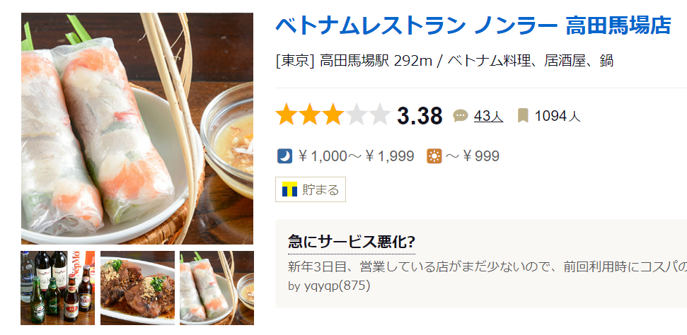 ★★★☆☆3.38 ■【8/31オープン】十条で★3.42の本格ベトナム料理店の2号店目!高田馬場駅5分 ■予算(夜):¥1,000~¥1,999