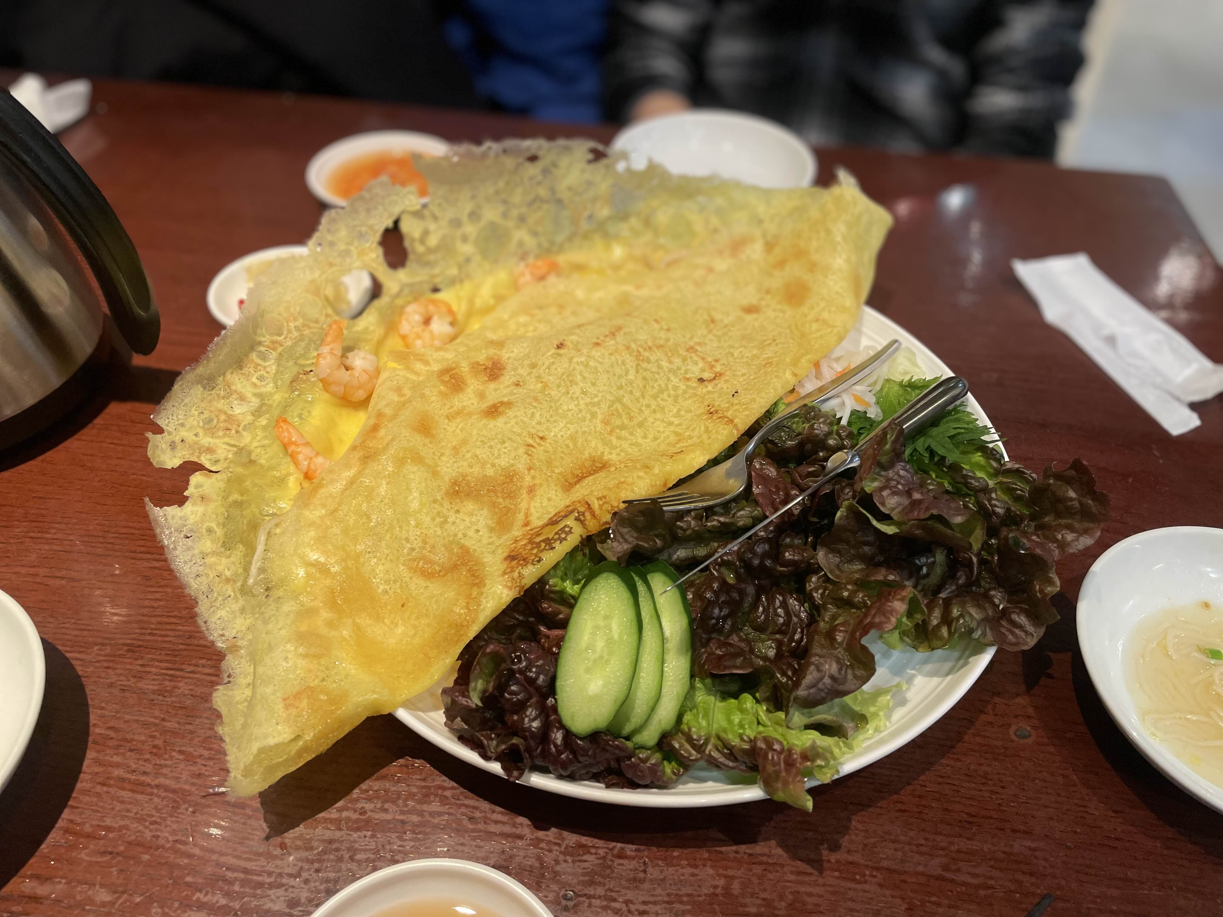 굳이 비교하자면 크레페 보다 얇은 느낌이라서 안에 새우랑 숙주가 가득 들어있는데