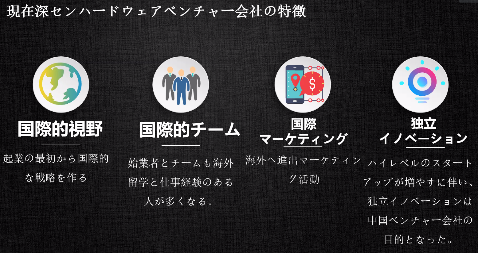 | 창업 초기부터 국제적인 전략을 세우다 | 창업자와 팀도 해외 유학 및 업무 경험이 있는 사람이 많아진다. | 해외 진출 마케팅 활동 | 고급 스타트업이 증가함에 따라 독립적 혁신은 중국 벤처기업의 목표가 되었다. |