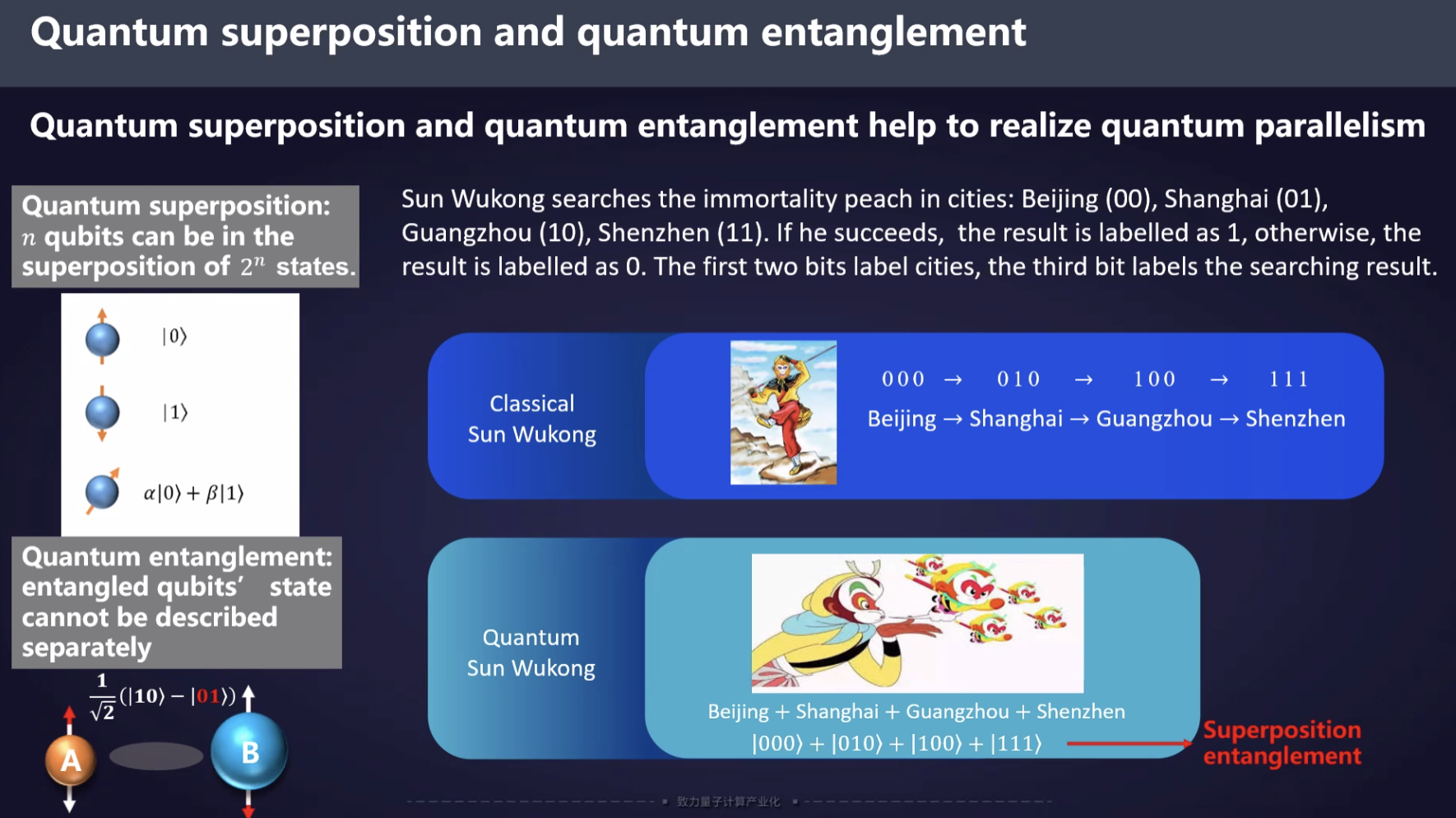 | 양자 중첩: n개의 큐비트는 2" 상태의 중첩에 있을 수 있습니다. |