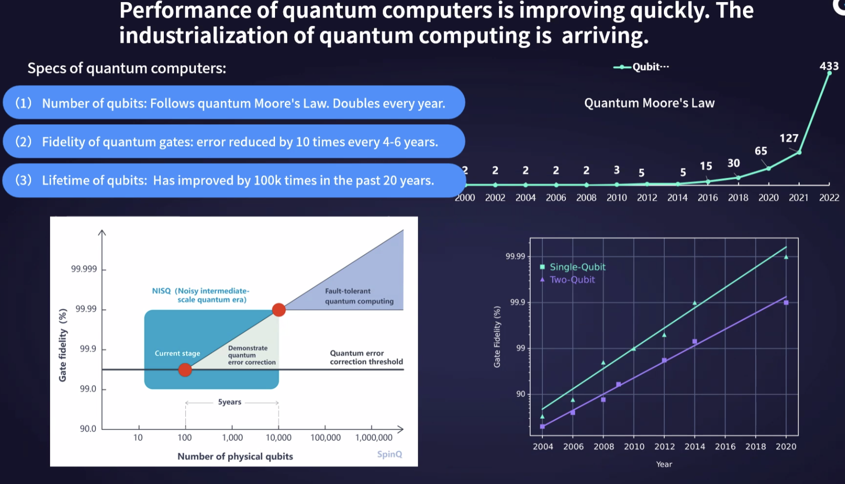 - 양자 게이트의 충실도: 4~6년마다 오류가 10배씩 감소합니다.