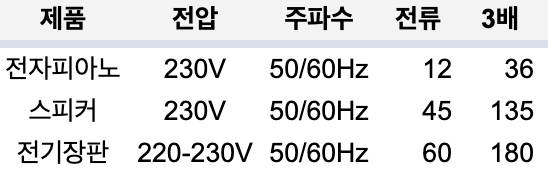 한국에서 구입하는 것과 큰 차이가 없고 50Hz까지 교차지원이 가능하는 점이 강점이다.