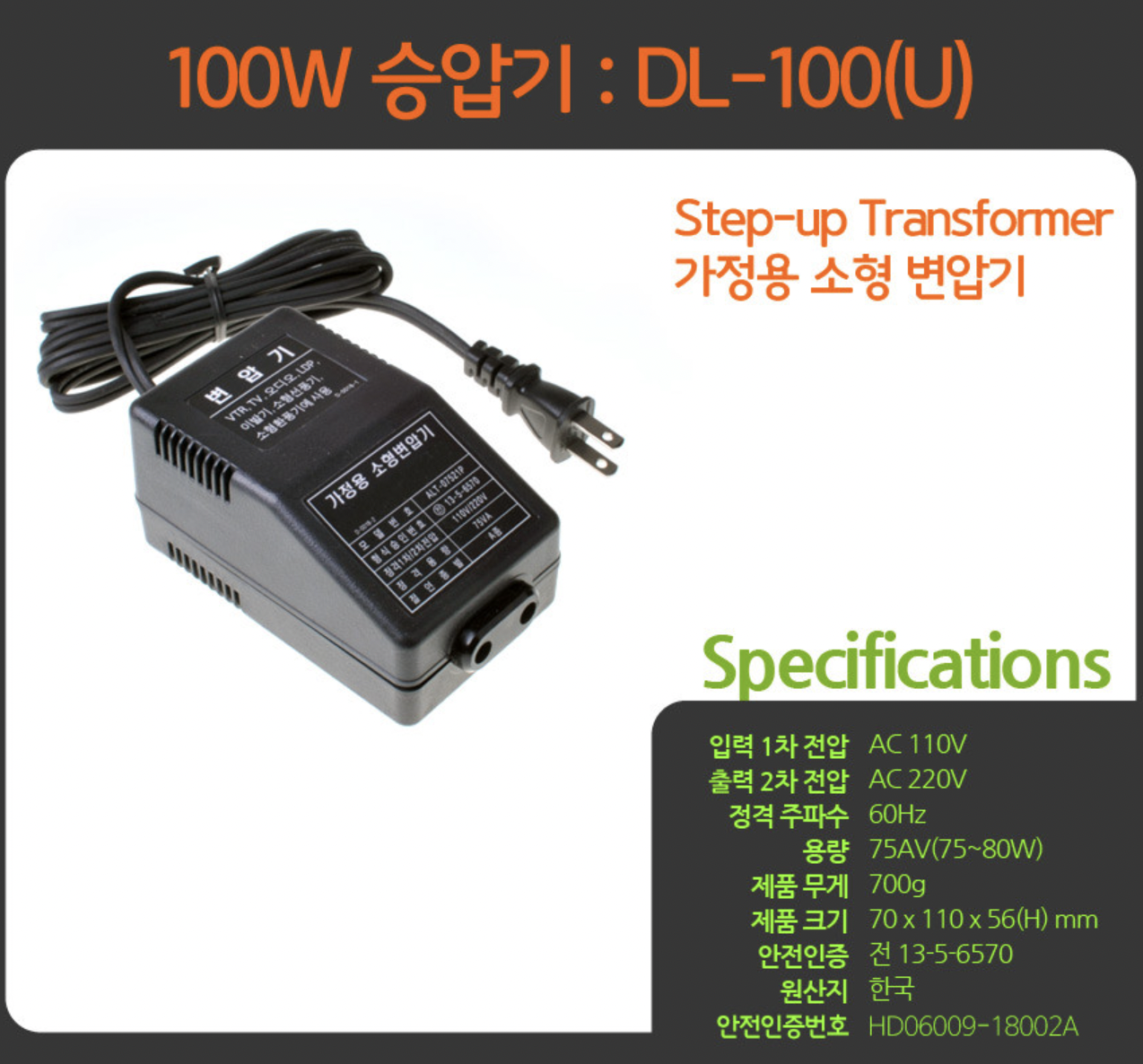 가정용 소형 변압기 100W 200W 300W 500W 110V 220V 국내용 해외용 미니 트랜스 도란스 : 로우락Rowlock