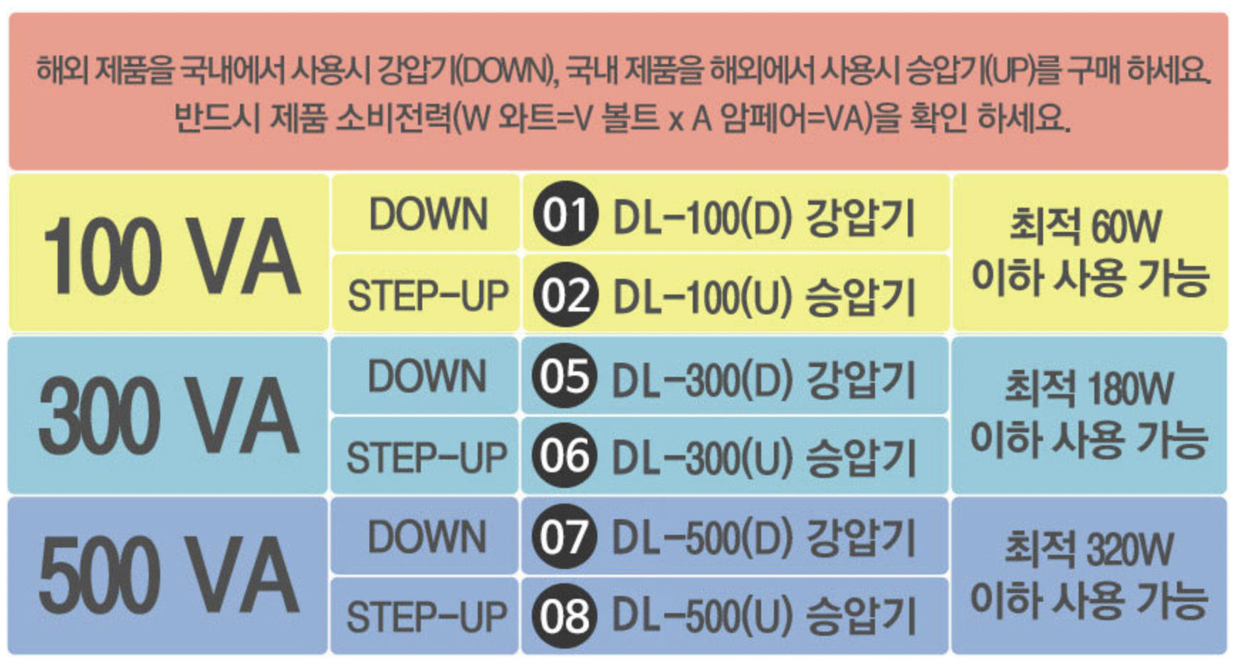한국제품 사용설명으로는, 60W제품까지는 100VA, 180W제품까지는 300VA을 선택하라고 하니 약 2배 정도를 권고하고 있다.