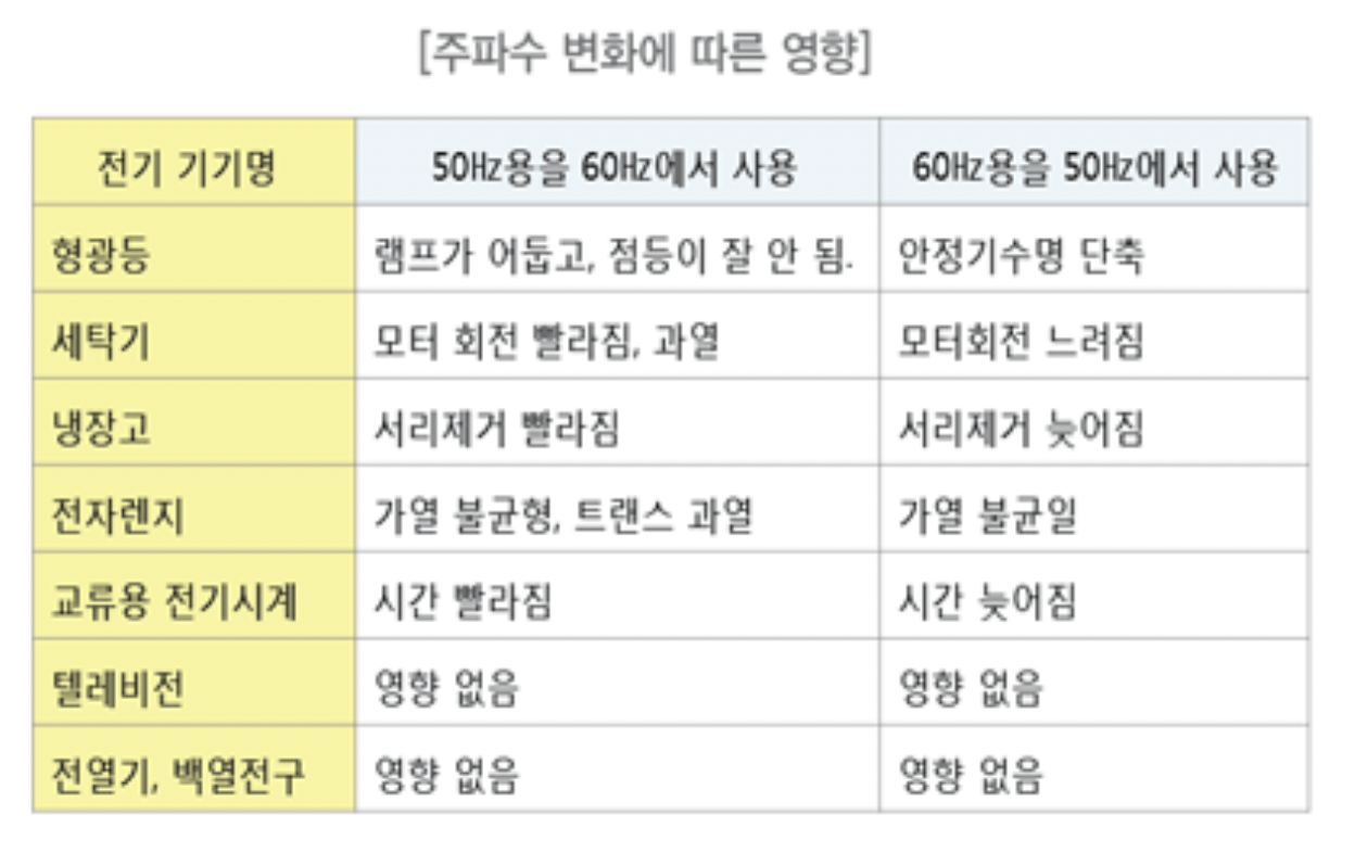 한국은 60Hz를 사용하고 있는데, 60Hz를 50Hz에서 사용하면 다음과 같은 문제가 있다고 한다.