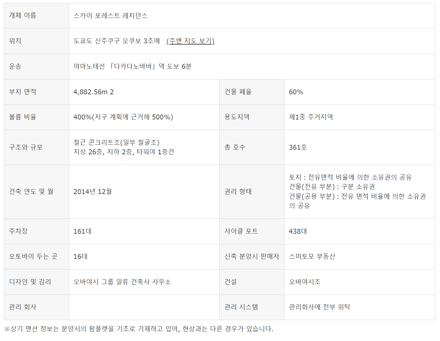 스카이포레스트 레지던스는 신주쿠 스카이포레스트라는 신주쿠 지역 야마노테선 안쪽의 대규모 복합 개발 프로젝트 내에 탄생한, 넓은 '토야마 공원'의 녹지와 함께하는 전체 361세대, 26층 건물의 내진 타워 레지던스입니다.