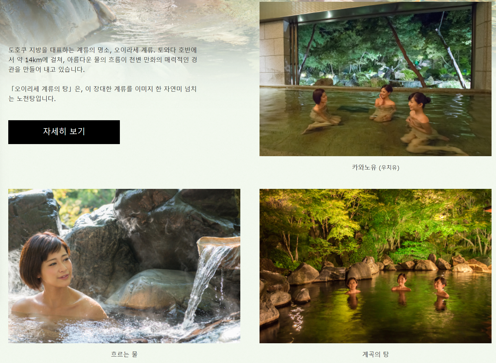 여탕 '오이라세 계류의 유'는 9종류의 욕조로, 아오모리현 오이라세 계류를 이미지화했습니다.