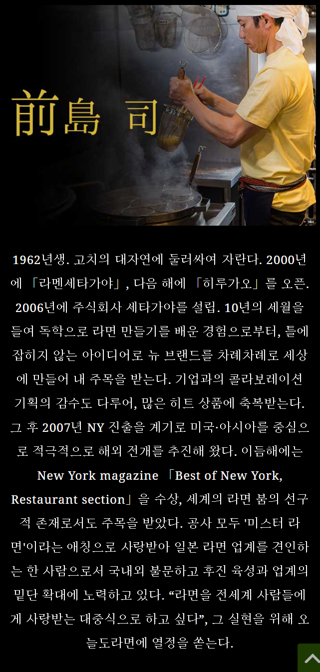 10년의 세월을 거쳐 독학으로 라멘 만들기를 배운 경험으로, 틀에 박히지 않은 아이디어로 새로운 브랜드를 차례로 세상에 내놓으며 주목받았습니다.