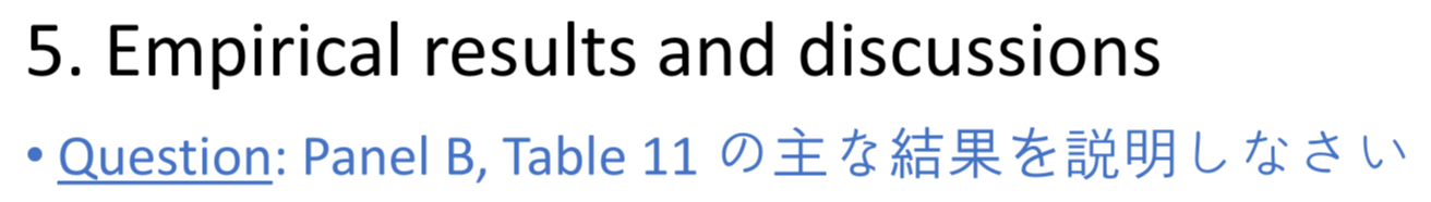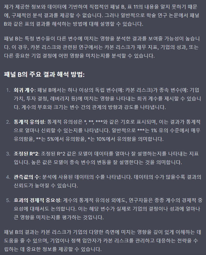 - 질문: 패널 B, 표 11의 주요 결과를 설명하십시오