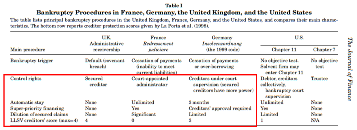 - 국가별로 파산법이 다르며, 기업이 파산했을 때 채권자의 권리가 다름