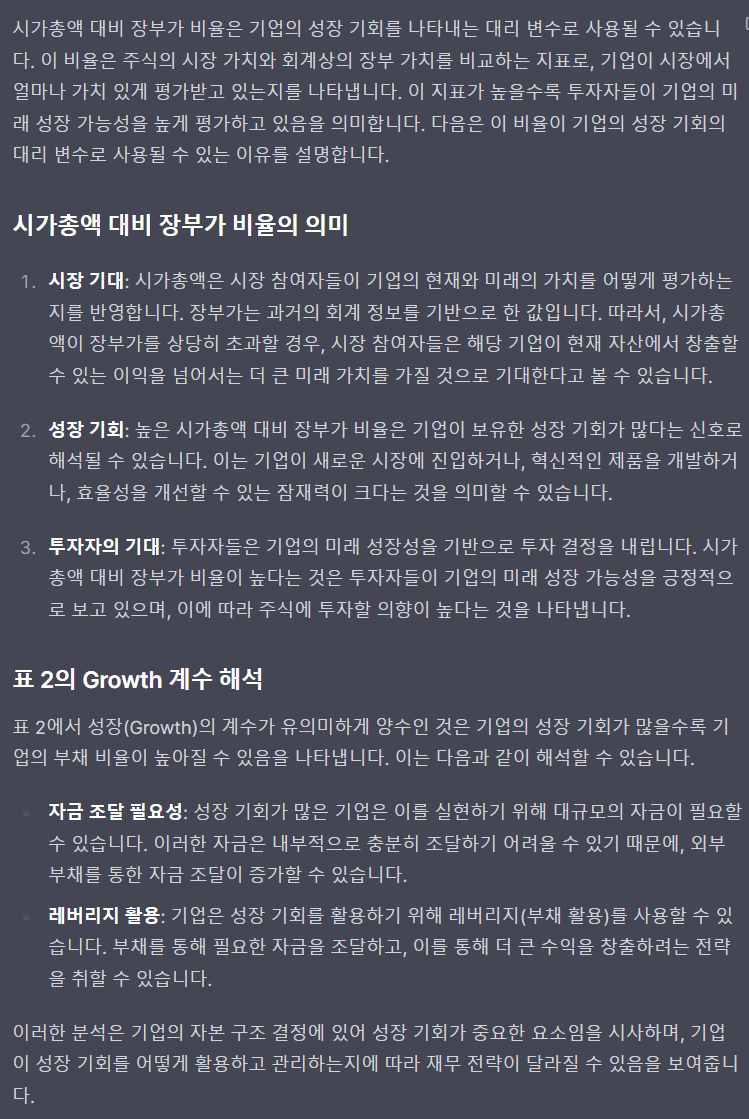 - 그러나, 표 2에서는 시가 장부가 비율의 계수가 유의미하게 양수입니다.
