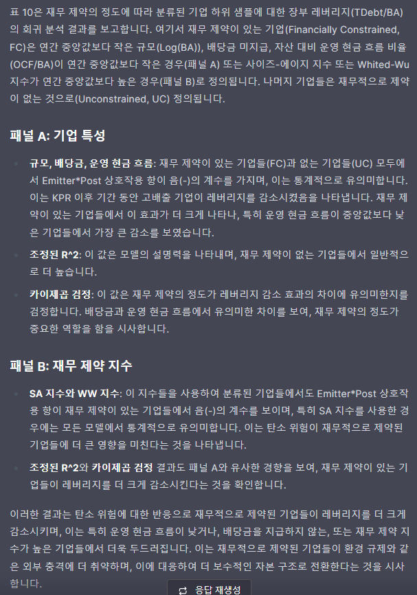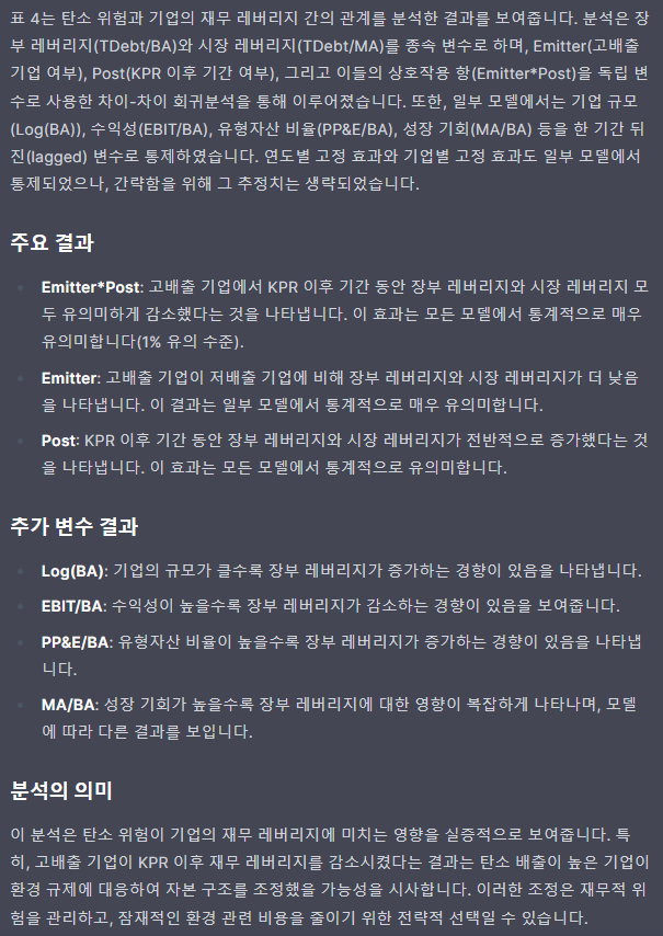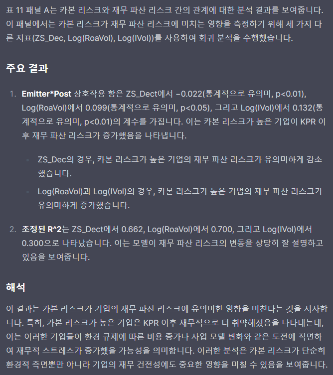 - 따라서, 재정적 파산 위험이 높은 기업은 KPR(탄소 위험 관련 규제) 전후로 부채 비율을 낮추는 것으로 예상됩니다.