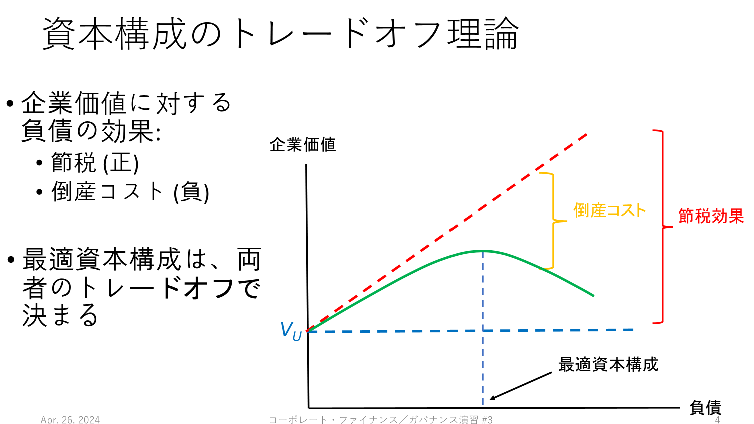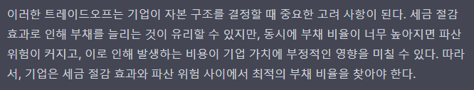 - 최적 자본 구성은 이 두 가지 요소의 트레이드오프에 의해 결정됩니다.