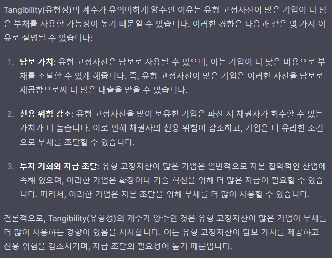 - 대기업은 일반적으로 현금 흐름이 안정적이며, 중소기업에 비해 같은 부채 비율에서의 파산 확률이 낮음