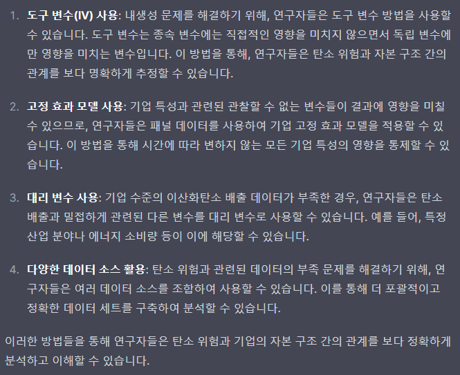 결과적으로, 단순한 분석(OLS)에서는 내생성 문제가 남을 수 있습니다. - 기업 수준의 이산화탄소 배출 관련 데이터를 충분히 얻기 어려워 적절한 추정이나 발견의 일반화가 어렵습니다.