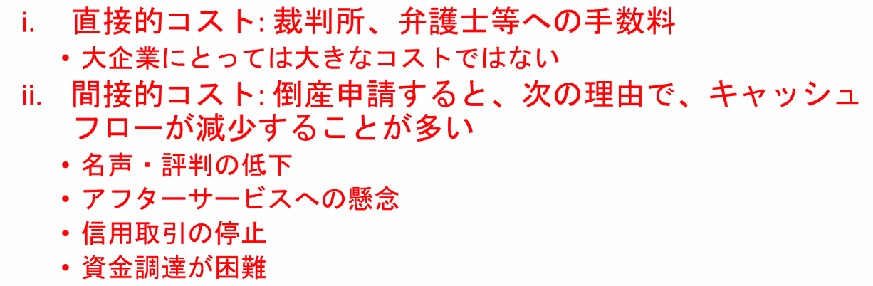 - 간접적 비용: 파산 신청을 하면, 다음과 같은 이유로 현금 흐름이 감소하는 경우가 많음