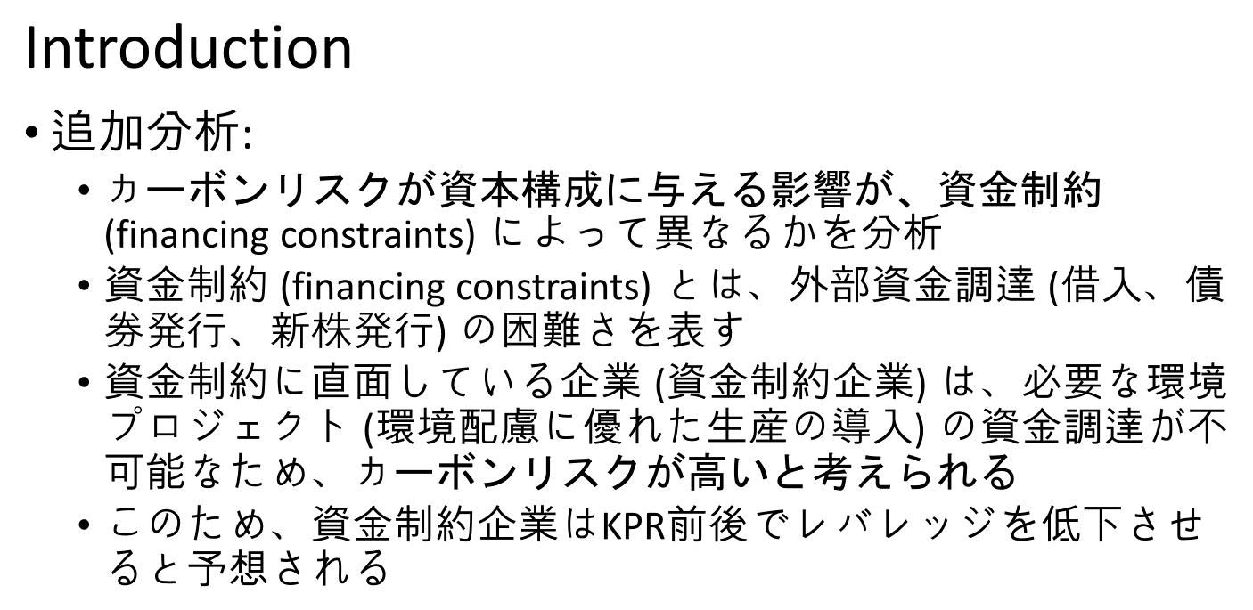 - 따라서, 자금 제약 기업은 KPR(탄소 위험 관련 규제) 전후로 레버리지를 낮추는 것으로 예상됨