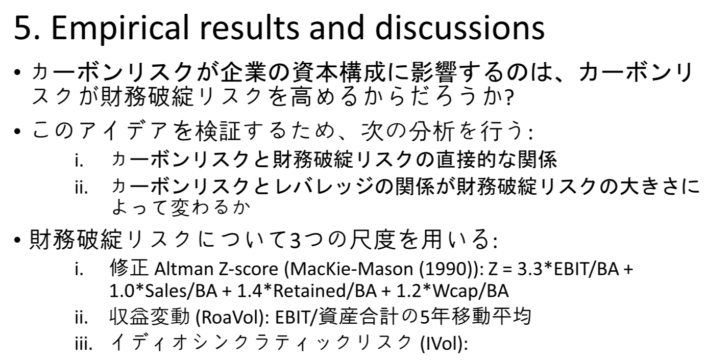 - 카본 리스크가 기업의 자본 구조에 영향을 미치는 것은 카본 리스크가 재무 파산 리스크를 증가시키기 때문일까요?