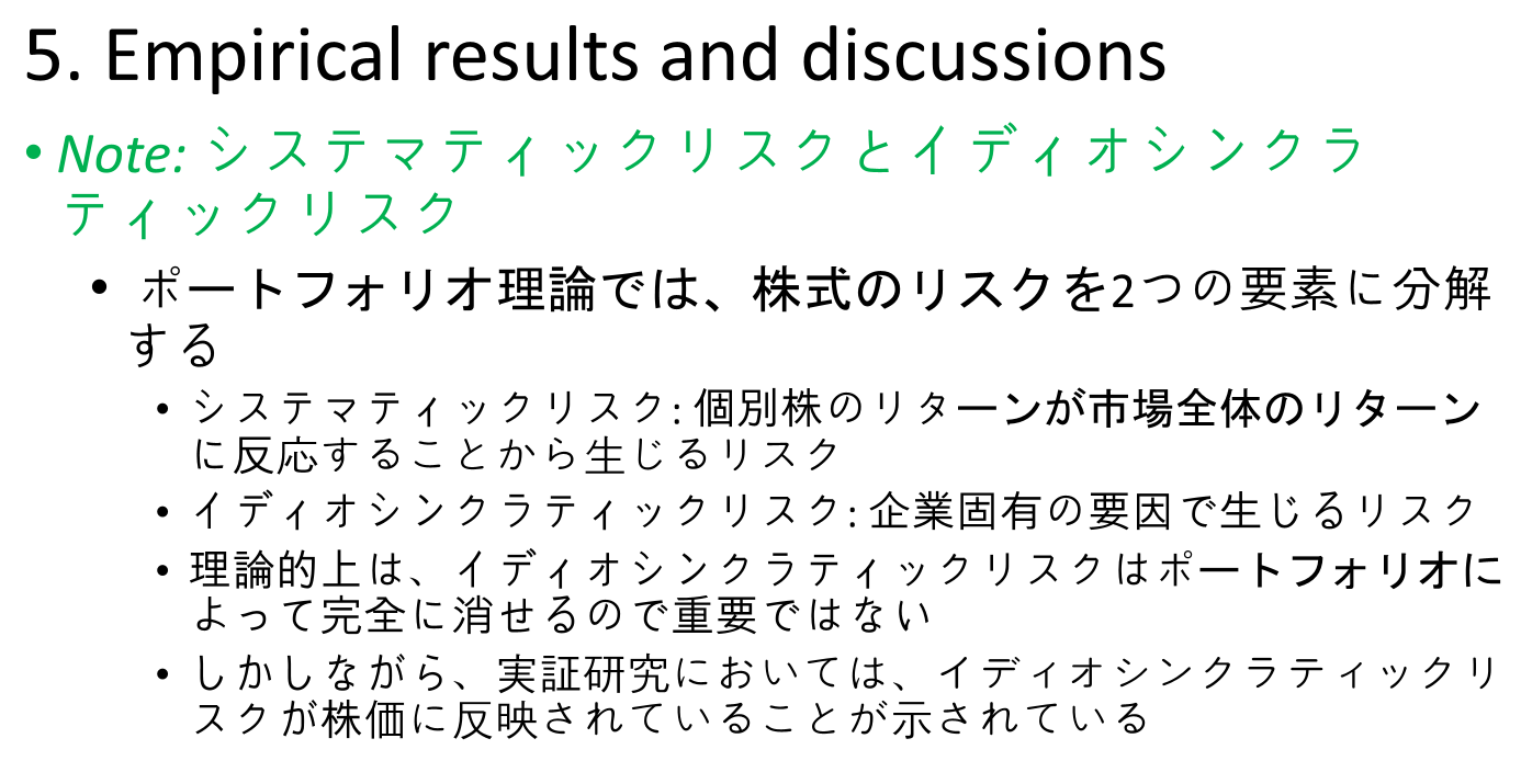 - 그러나, 실증 연구에서는 이디오싱크라틱 리스크가 주가에 반영되고 있다는 것이 나타나고 있습니다.