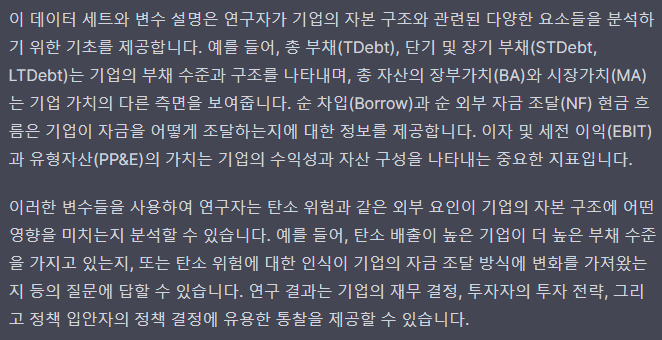 - 탄소 위험의 증가는 기업의 재정적 파산(도산) 위험에 영향을 미치며, 이는 기업의 자본 구조에 영향을 줄 수 있다.