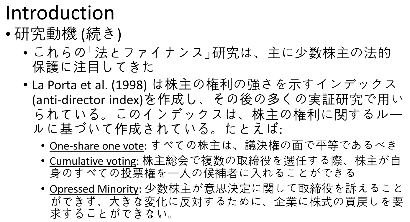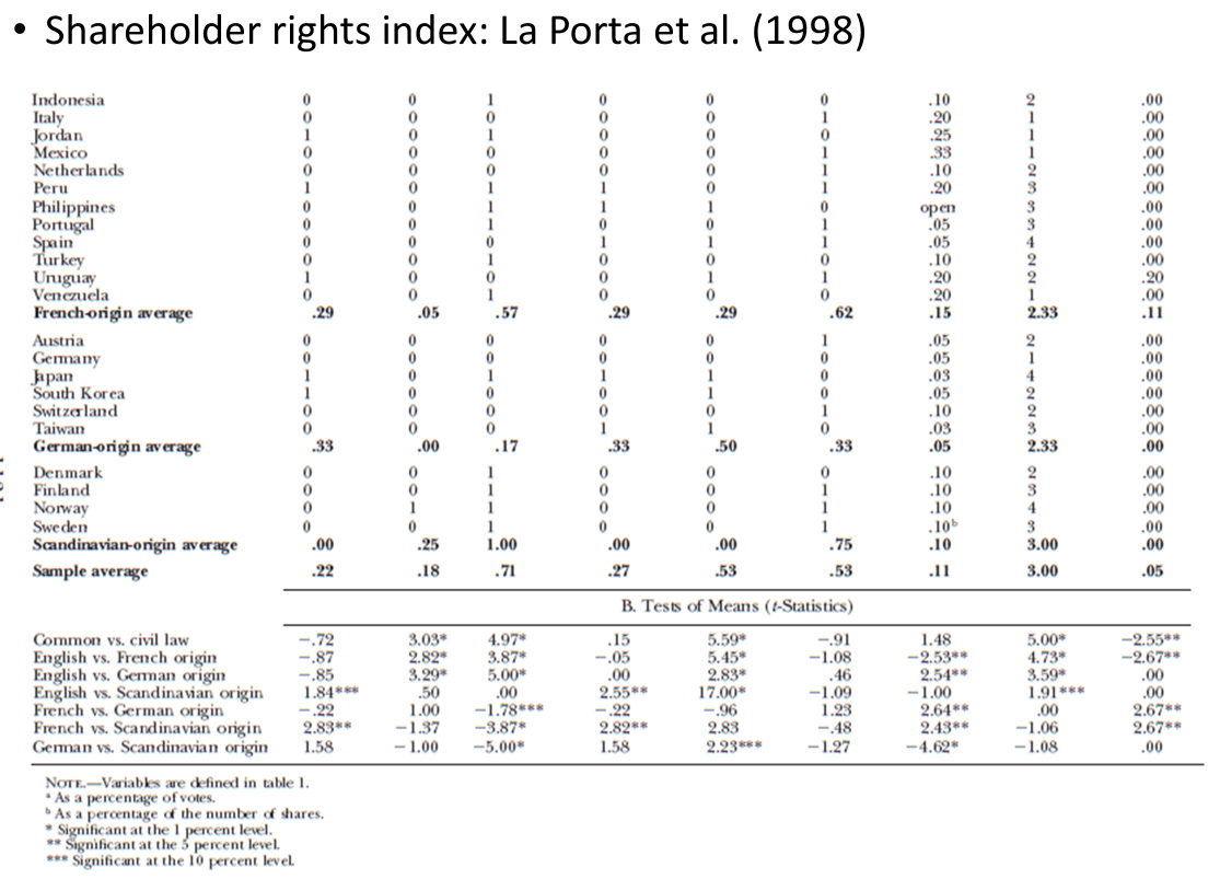 - La Porta et al. (1998)은 주주의 권리 강도를 나타내는 지수(Anti-Director Index)를 만들었으며, 이후 많은 실증 연구에서 사용되었다.