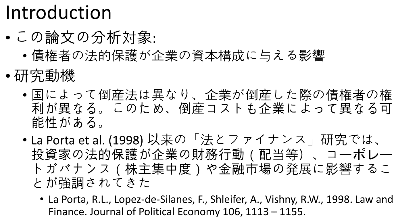 이로 인해 파산 비용도 기업마다 다를 수 있음 - La Porta et al. (1998) 이후의 '법과 금융' 연구에서는, 투자자의 법적 보호가 기업의 재무 행동(배당 등), 기업 거버넌스(주주 집중도) 및 금융 시장의 발전에 영향을 미친다는 것이 강조되어 왔습니다.