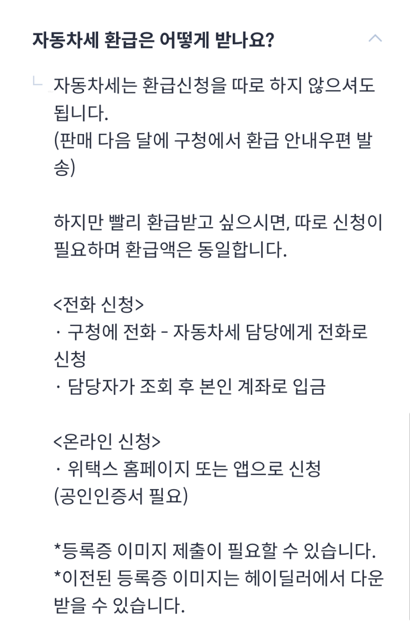 자동차세는 가만히 있으면 알아서 환급을 해주는데 좀 더 일찍 환급받고 싶으면 구청으로 전화해서 환급해달라고 하면 된다. 온라인 홈택스로도 확인이 가능하나 이는 시차가 좀 있어서 전화로 하는게 가장 빠르고 정확하다.