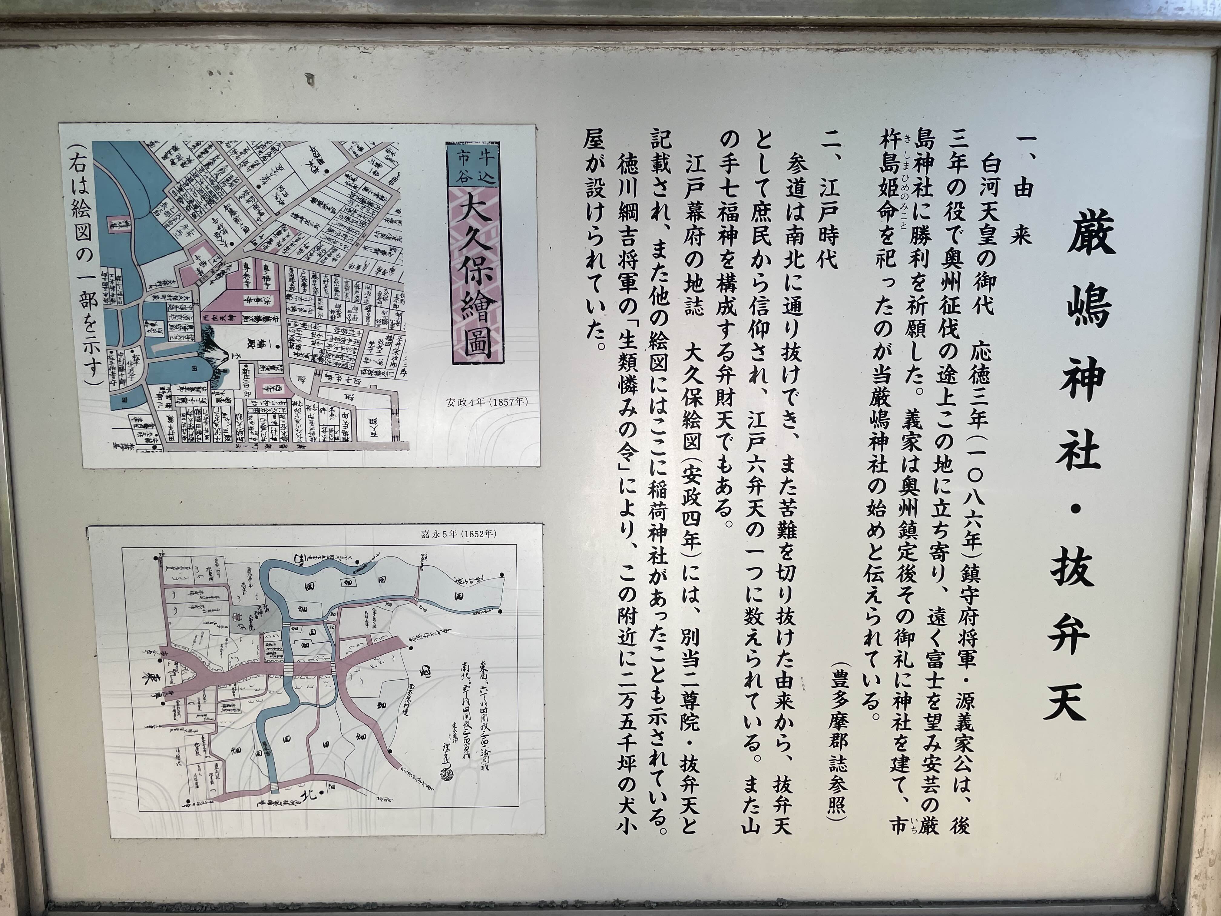 또한 야마노테 시치후쿠신을 구성하는 벤자이텐이기도 합니다. 에도 막부의 지지 대오쿠보 에즈(안세이 4년)에는, 별당 니존인・누케벤텐으로 기록되어 있으며, 또 다른 그림에는 여기에 이나리 신사가 있었다는 것도 나타나 있습니다.