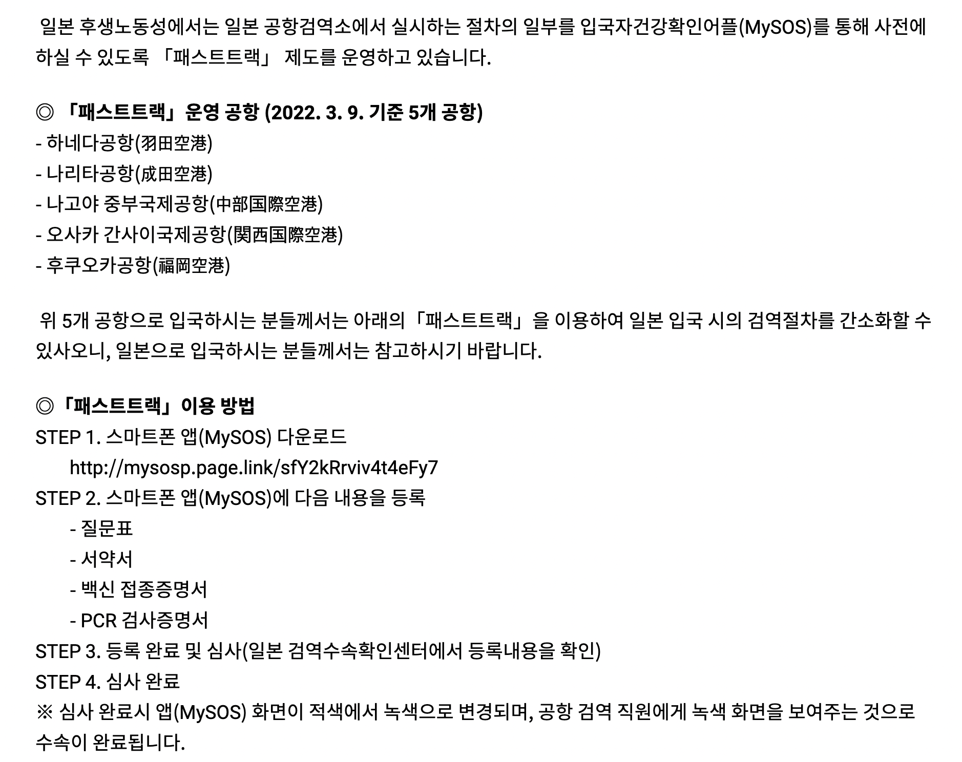 일본 후생노동성에서는 일본 공항검역소에서 실시하는 절차의 일부를 입국자건강확인어플(MySOS)를 통해 사전에 하실 수 있도록 「패스트트랙」 제도를 운영하고 있습니다. ◎ 「패스트트랙」