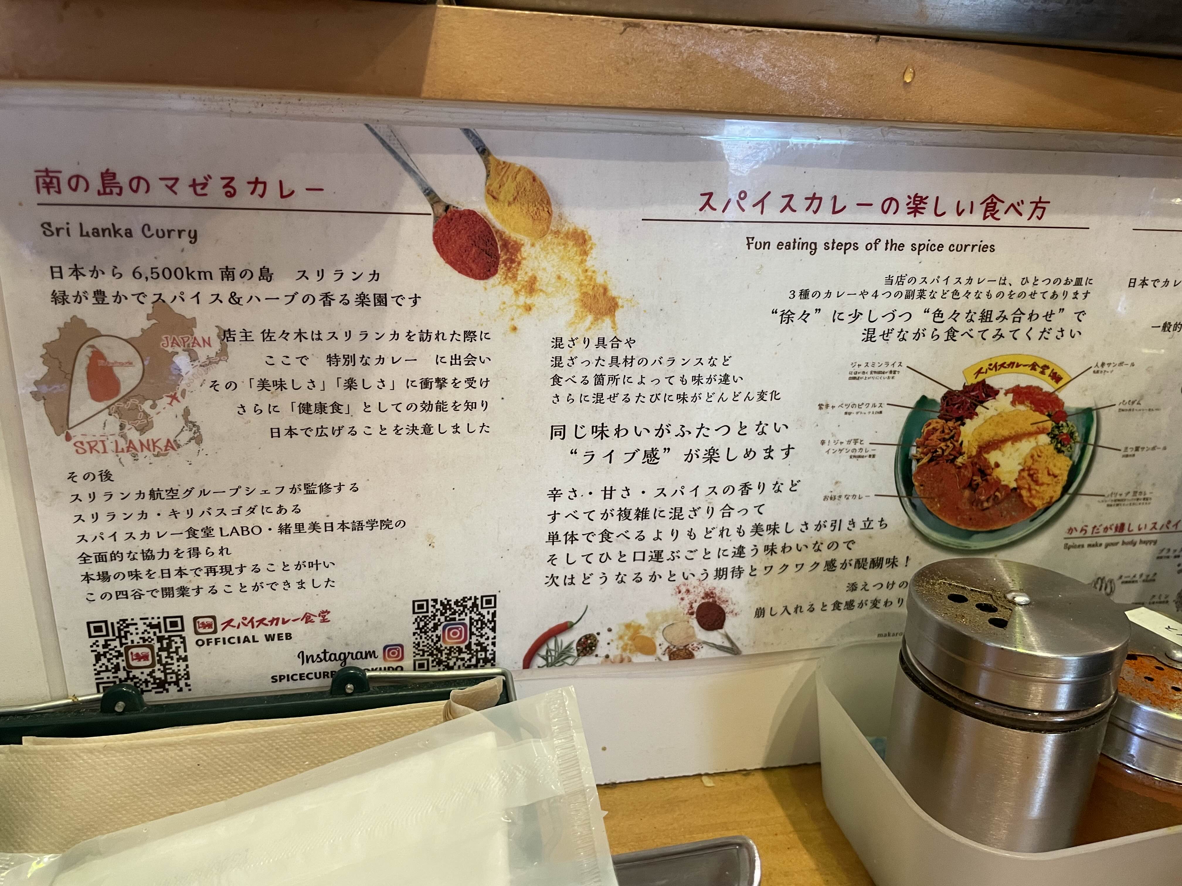 그 후, 스리랑카 항공 그룹 셰프가 감독하는 스리랑카 키리바스고다에 있는 스파이스 카레 식당 LABO와 오리미 일본어 학원의 전면적인 협력을 얻어, 본고장의 맛을 일본에서 재현할 수 있게 되었고, 이곳 요츠야에서 개업할 수 있었습니다.