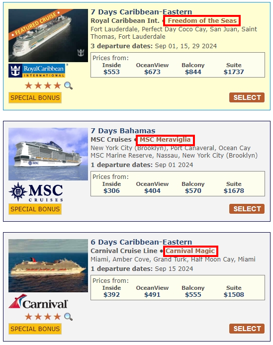 크루즈닷컴에서 조회하면 정말 별의 별게 다 나온다