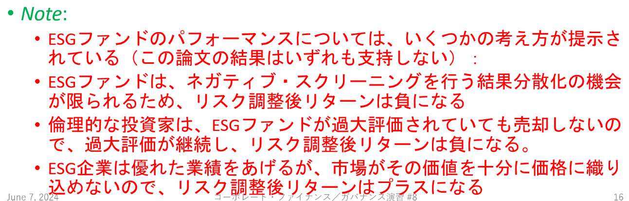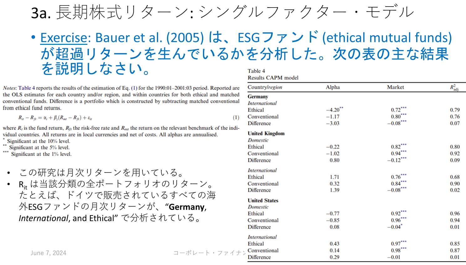 - 연습 문제: Bauer et al. (2005)은 ESG 펀드(윤리적 투자신탁)가 초과 수익률을 창출하는지 분석하였다.