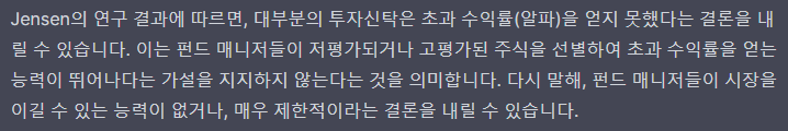 Jensen (1968)은 1945년부터 1964년까지의 오픈 엔드형 투자신탁 115개의 데이터를 사용하여 이 생각이 맞는지 검증하였다.
